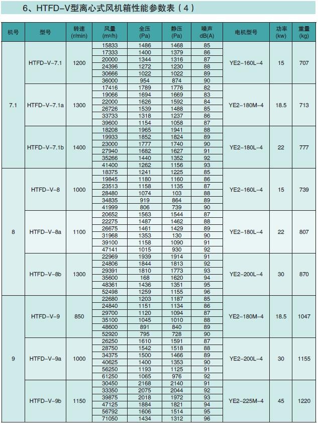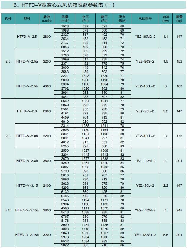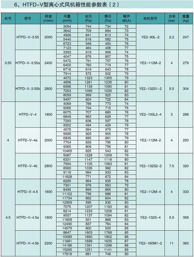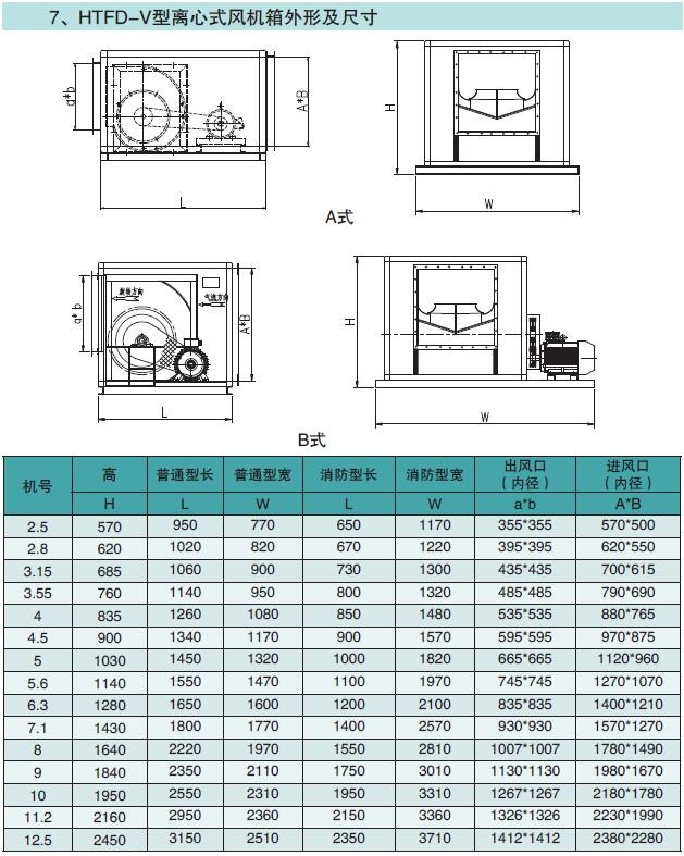 1.1.HTFD-Ⅴ型离心式风机箱是-种叶片为后倾式箱形离心风机,产品由低噪声后倾叶片式离心风机、电机、轴承、传动件、消声型箱体等组成。根据安装位置的不同,提供12种不同角度的进出风口位置,以满足用户不同安装环境需要。根据消防与通风的要求不同分A型和B型两种类型,B型电机装在箱体外用于消防排烟,并经国家消防装备监督质量检验中心按GA211-2009《消防排烟风机耐高温试验方法》进行耐高温试验,能在280℃高温条件下连续运行60分钟以上;A型电机装在箱体内,用于通风换气。