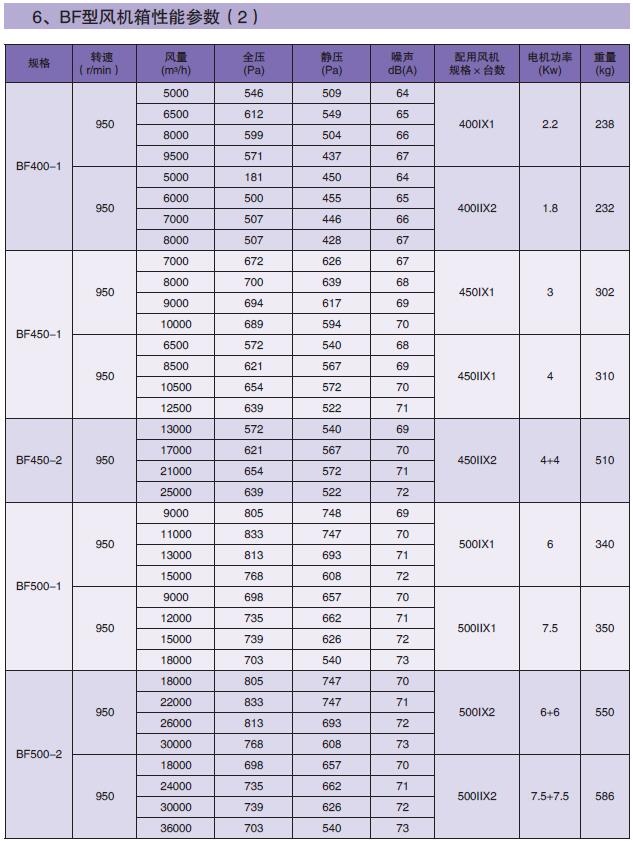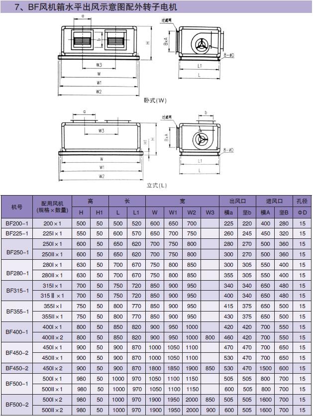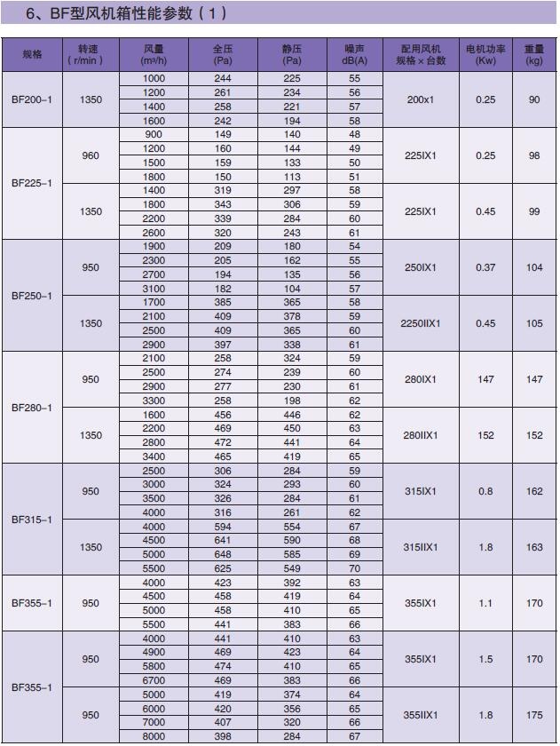 1.1.BF型风机箱叶轮采用前倾式多翼叶轮和低噪声外转子电机,电机与叶轮为直联,风机噪声比皮带传动式风机箱低。